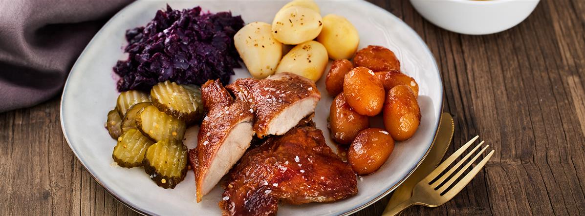 Flæskesteg m/svær, rødkål, brunede kartofler, hvide kartofler, brun sovs og asier.